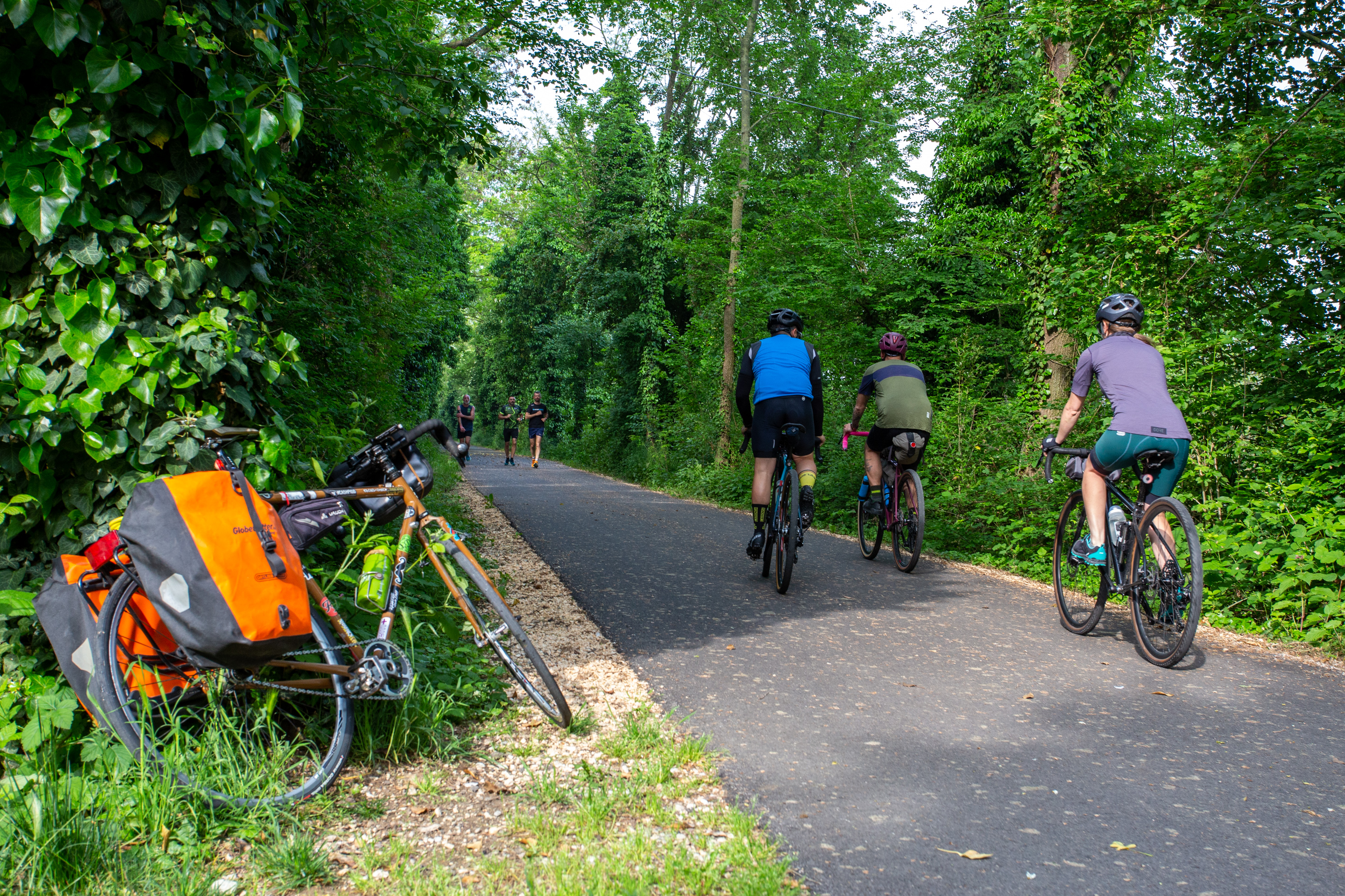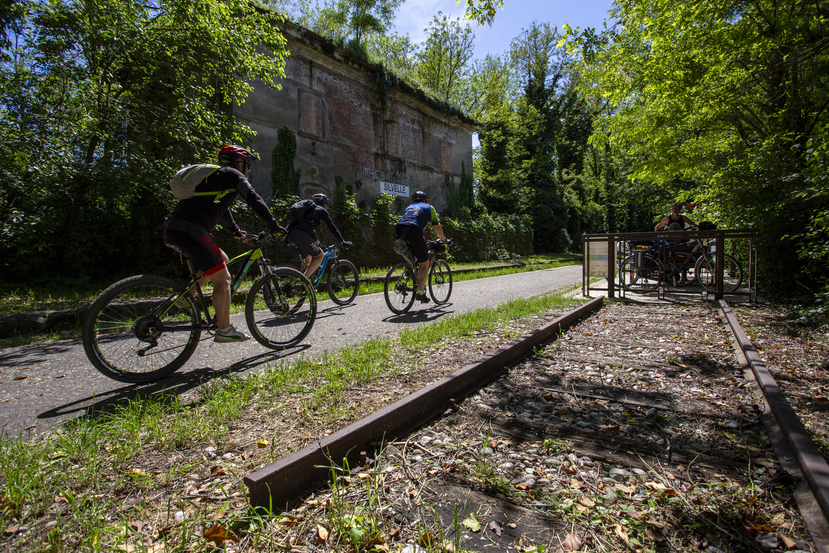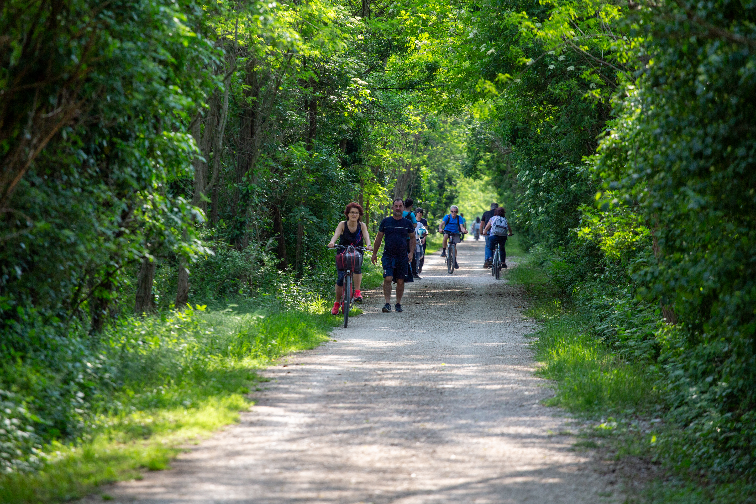 Proseguendo verso ovest, il paesaggio diventa sempre più rurale, con campi di grano, pioppeti e filari di viti. La ciclovia segue il tracciato della vecchia ferrovia, attraversando tratti di bosco che regalano ombra e frescura.